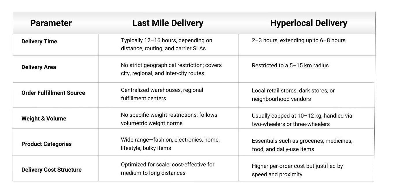 While both aim to deliver orders to customers, last-mile delivery typically covers longer distances from regional warehouses and takes 12–16 hours. Hyperlocal delivery, on the other hand, operates within a limited radius and focuses on same-hour or same-day delivery, often within 2–3 hours.